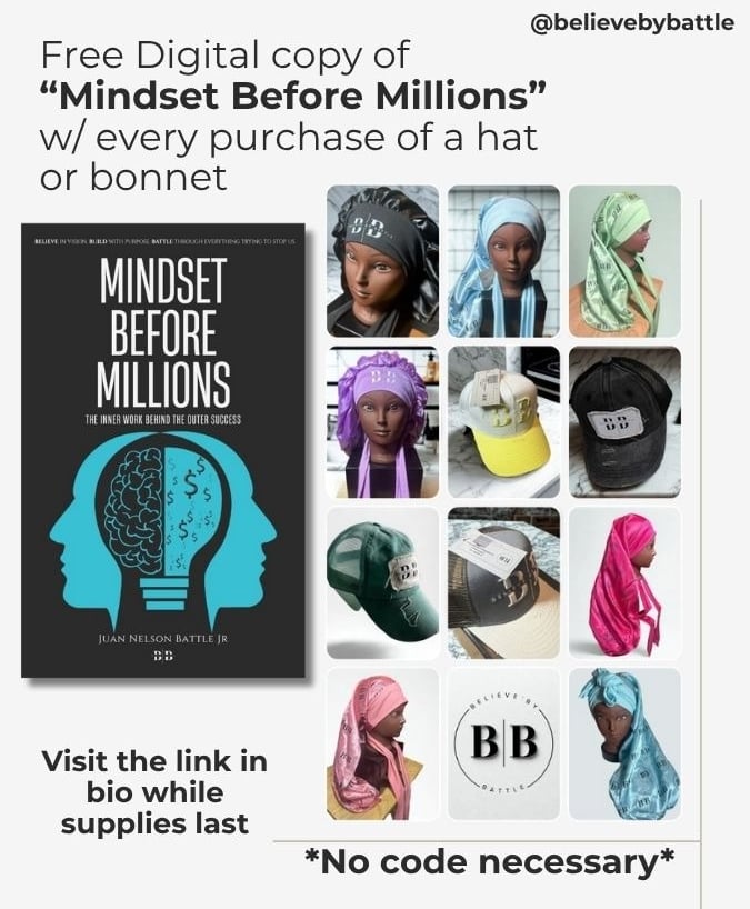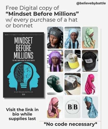 Get gifted a digital copy of "Mindset Before Millions" when you shop Believe By Battle signature Bonnets or Hats